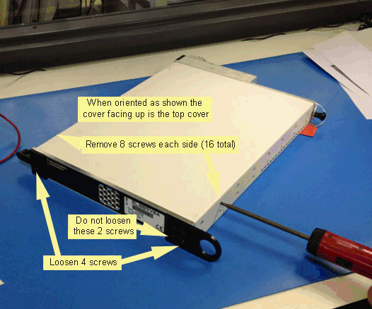 1) Orient the TIM as shown to remove the top cover. Note: The label orientation can not be used to identify the top cover. On some TIMs the label orientation is reversed. You must identify the top cover by the orientation of the top and bottom latches.