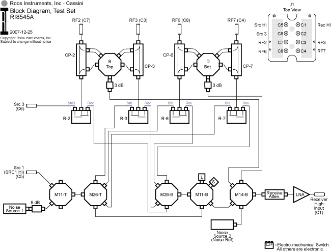The typical RF Test Set contains the couplers, microwave switches, Bi-state loads, RF attenuator, low noise amplifier and the noise source necessary to make multi-port S-parameter, RF power and noise figure measurements. To perform a stimulus/response measurement such as forward gain (S21) DUT stimulus signals from the microwave sources are routed through the Test Set to the Device-Under-Test (DUT). The RF Test Set uses high speed microwave pin switches to selectively route the test signals received from the DUT to the System Receiver for measurement.