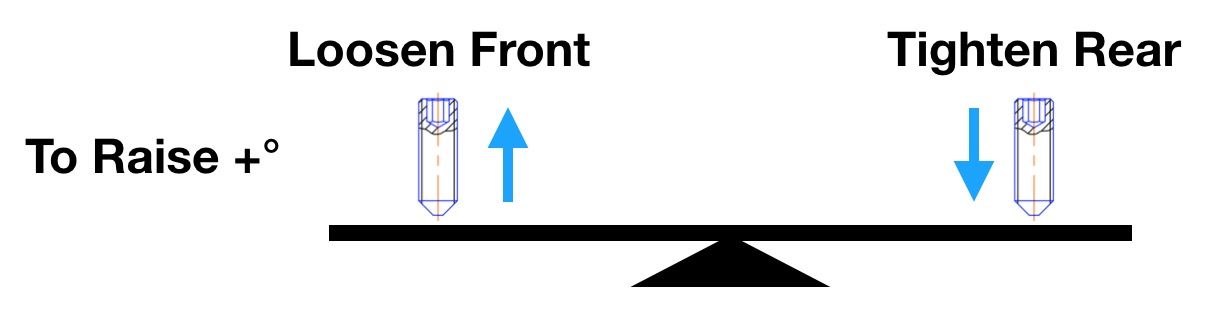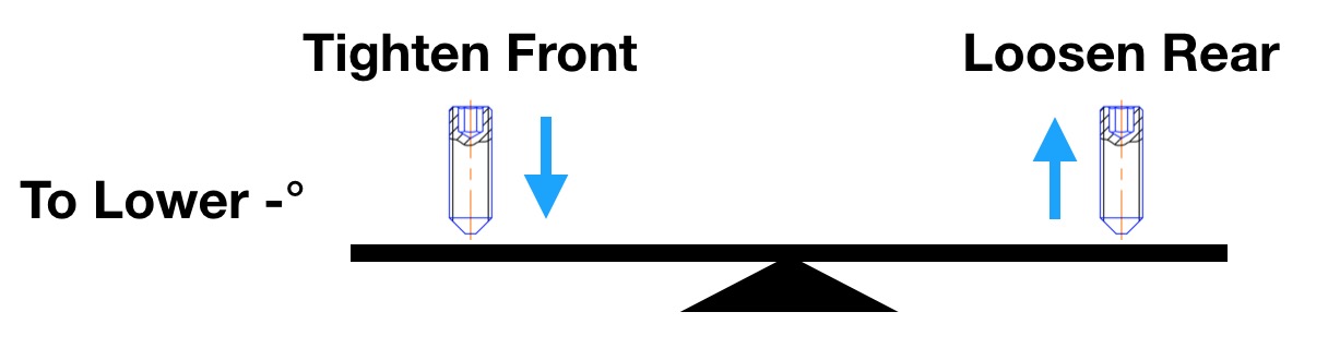 To lower the front, loosen the rear screw first then tighten the front screw.