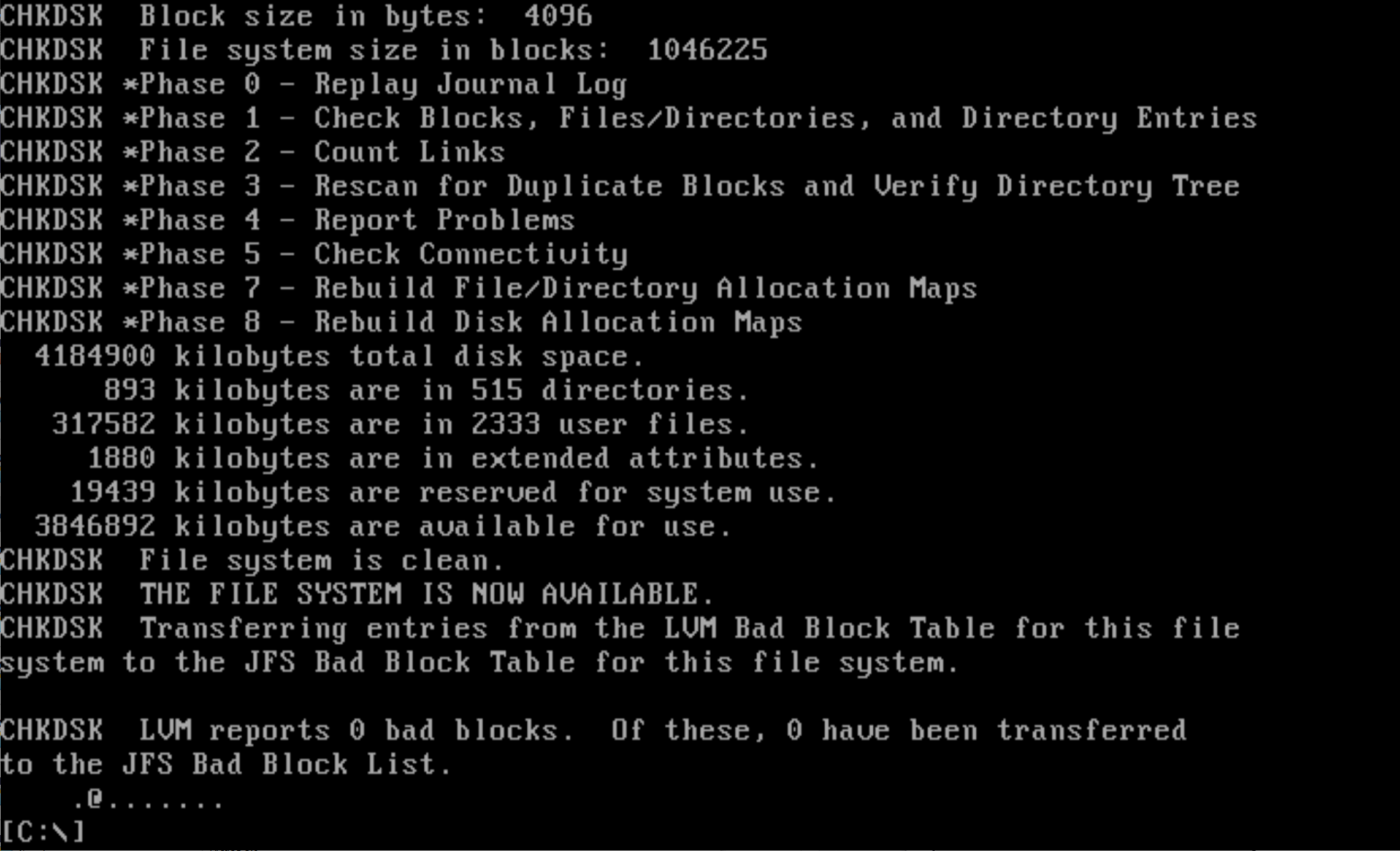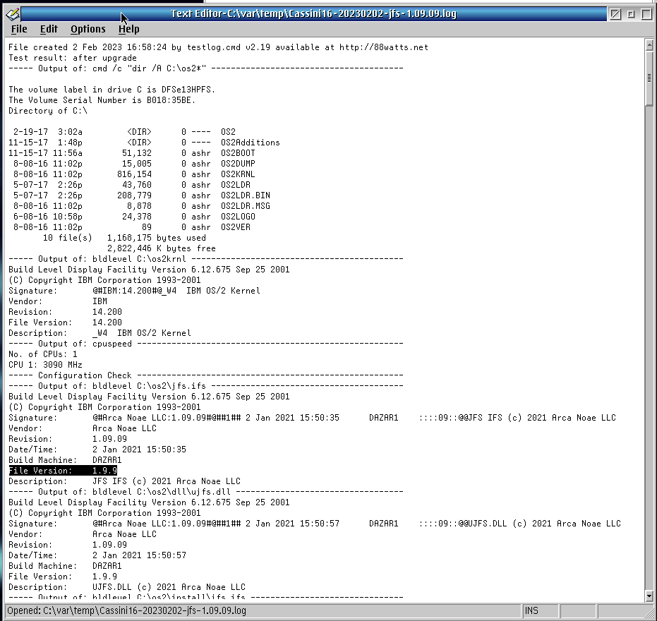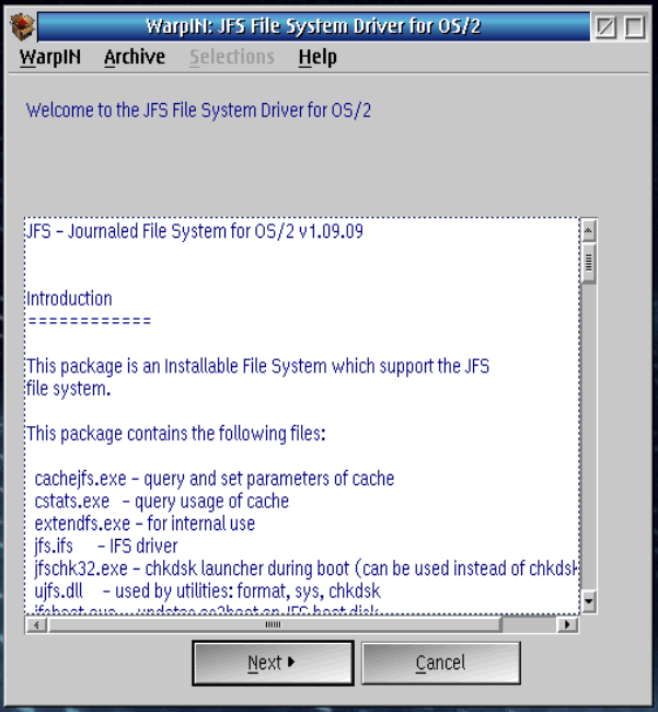 - Open c:/sys/doc/JFS/ReadMe.txt, confirm "JFS - Journaled File System for OS/2 v1.09.09" on the first line. This file is created during install of the update.