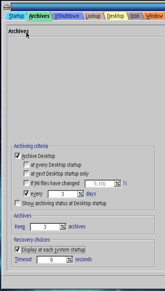 - Choose Archives tab and confirm "Display at each system startup" is enabled and change Timeout to 5 seconds.